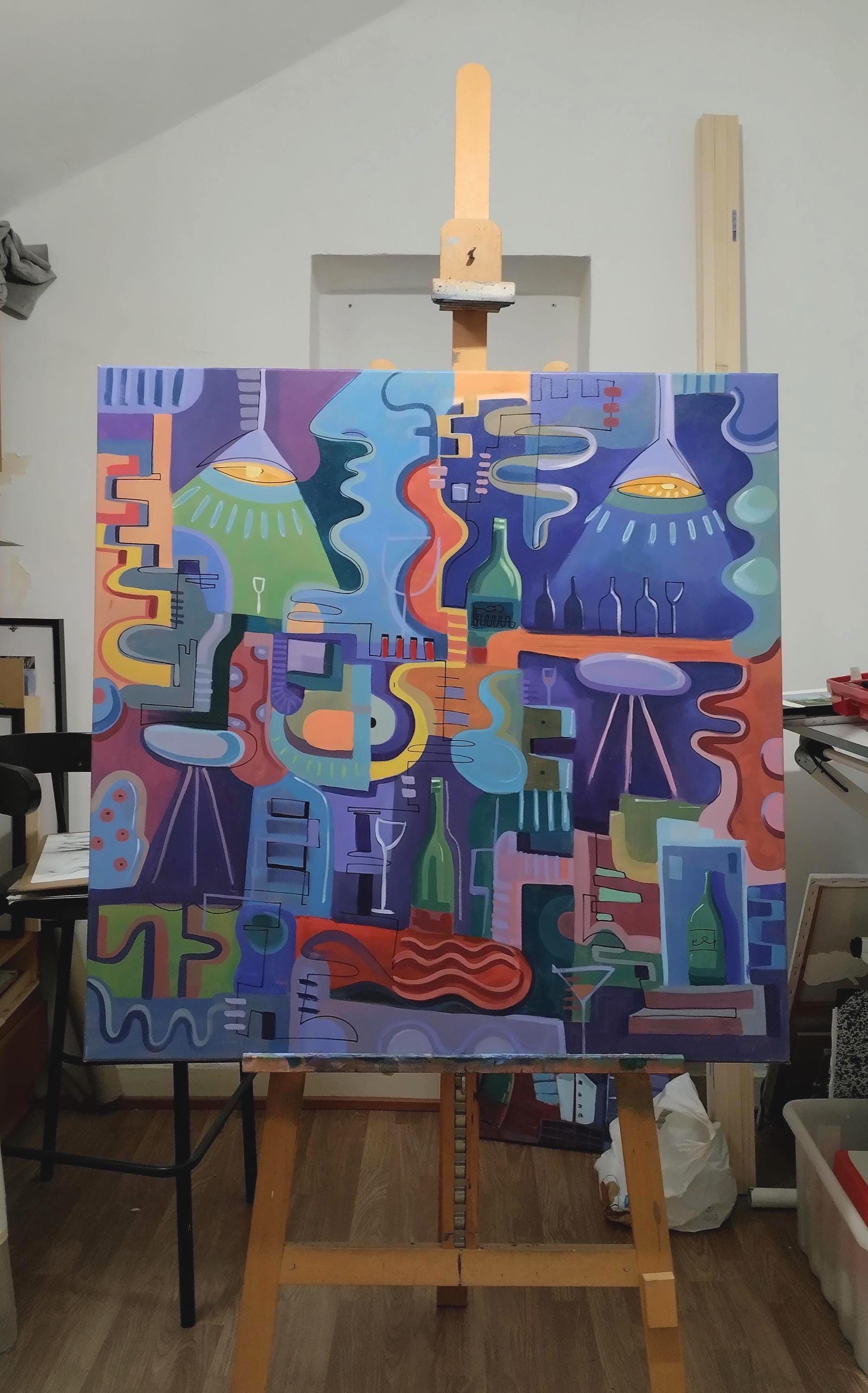 Cocktail BarMedium: Acrylic and Oil on Canvas Dimensions: 100 x 100 cmYear: 2023 Authenticity: Includes a Certificate of AuthenticityOil and acrylic on canvas inspired by personal experience working in restaurants and bars.