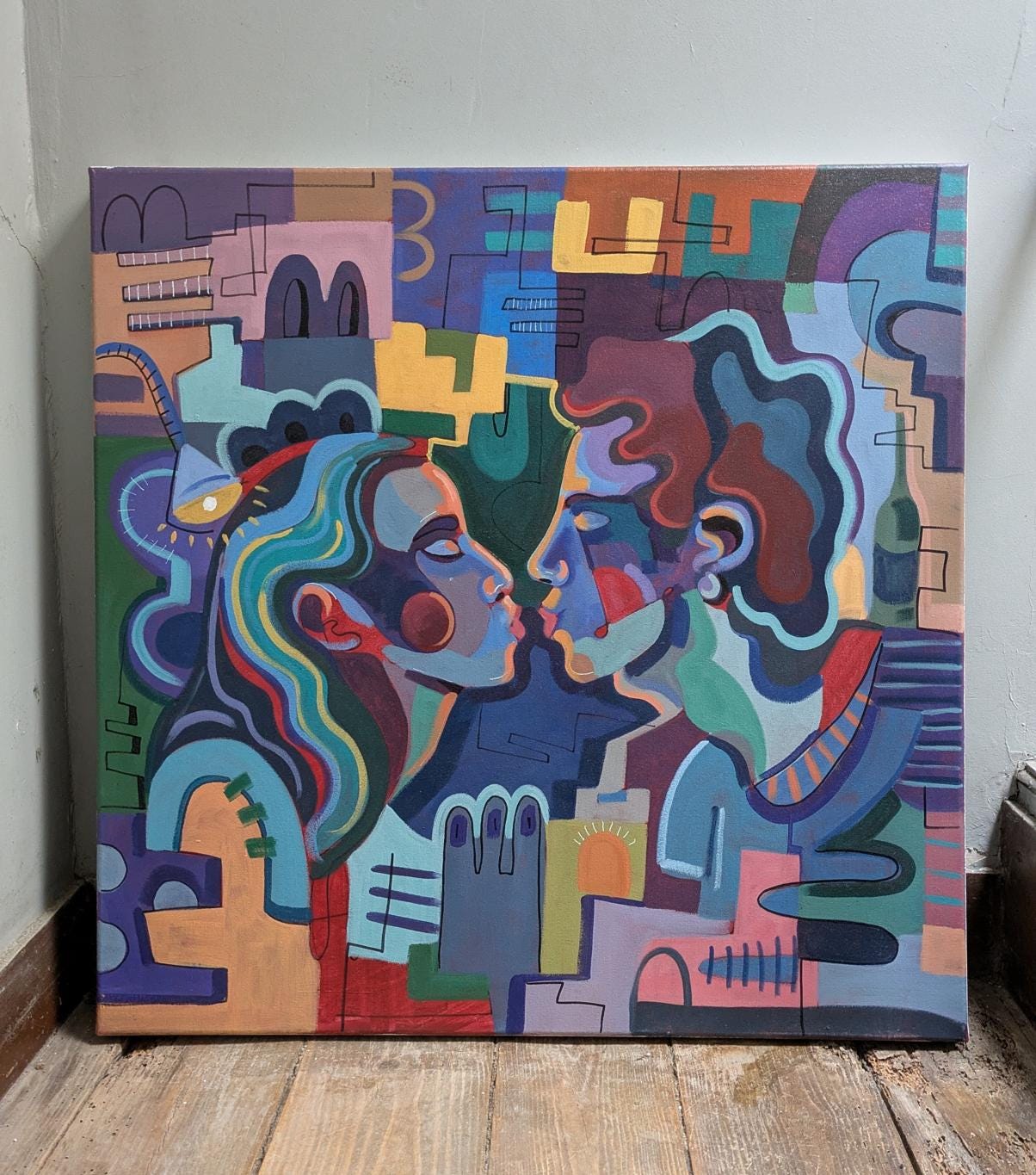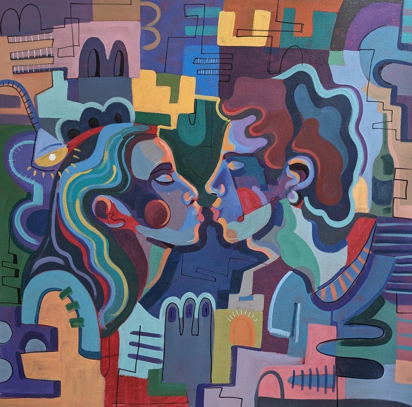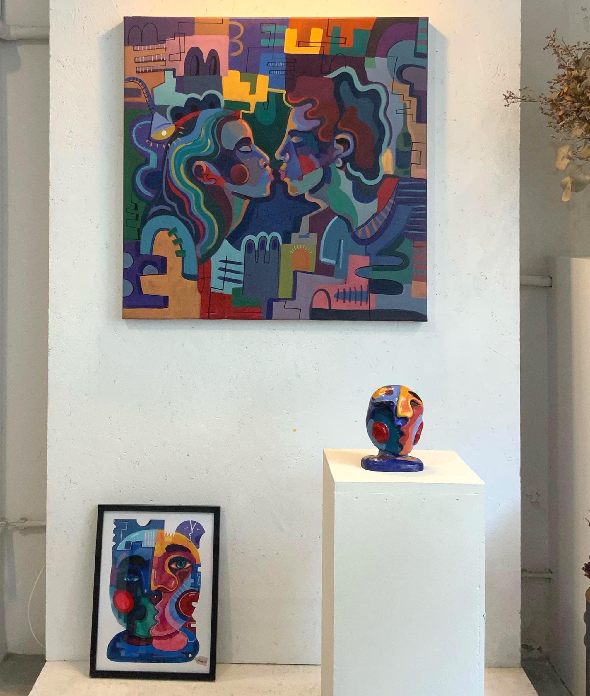 Part of the Half Moons series, this painting depicts two faces drawing near in a nocturnal setting. The geometric forms and fragmented structure suggest an ambiguity between presence and distance, desire and restraint.