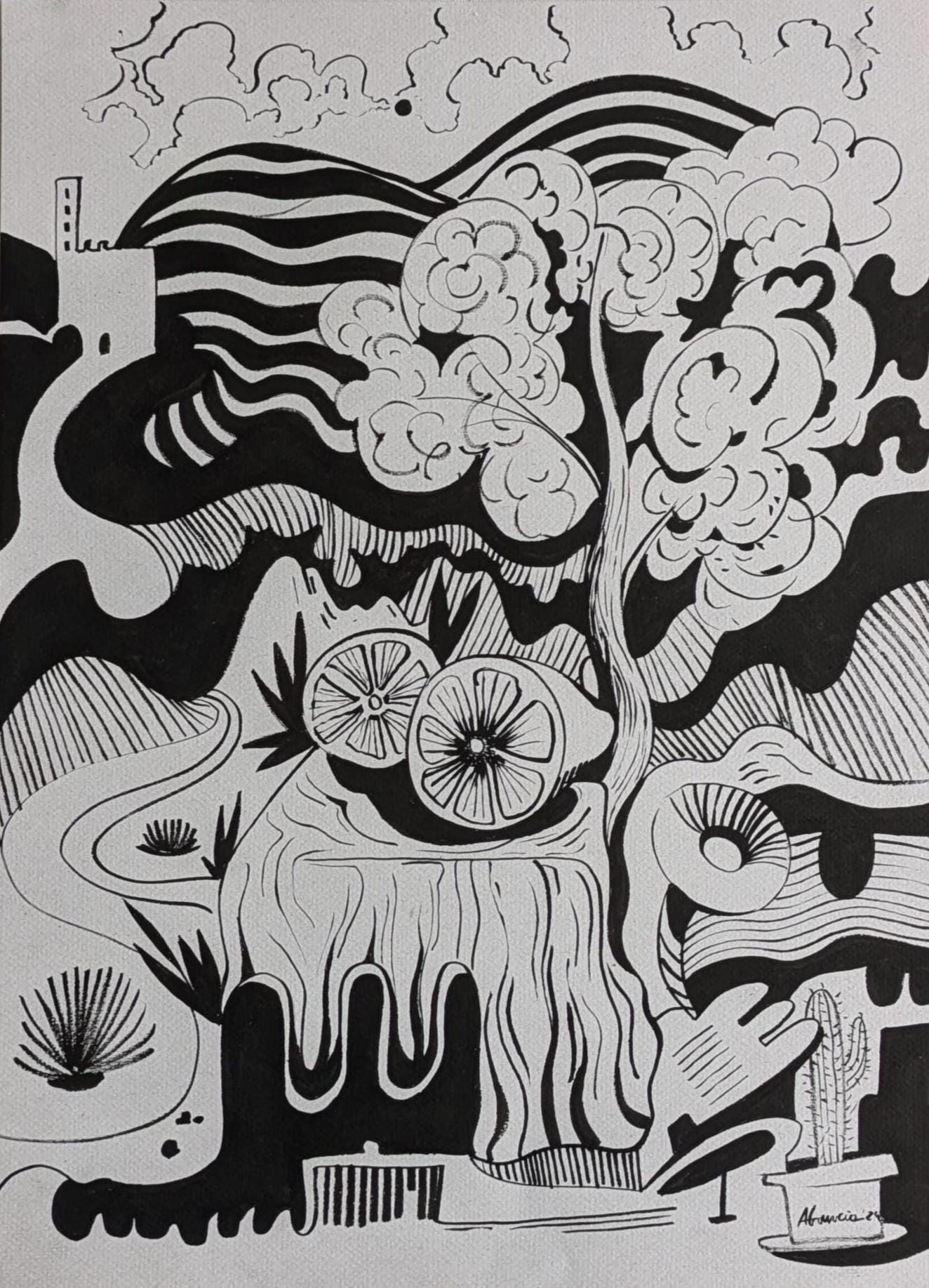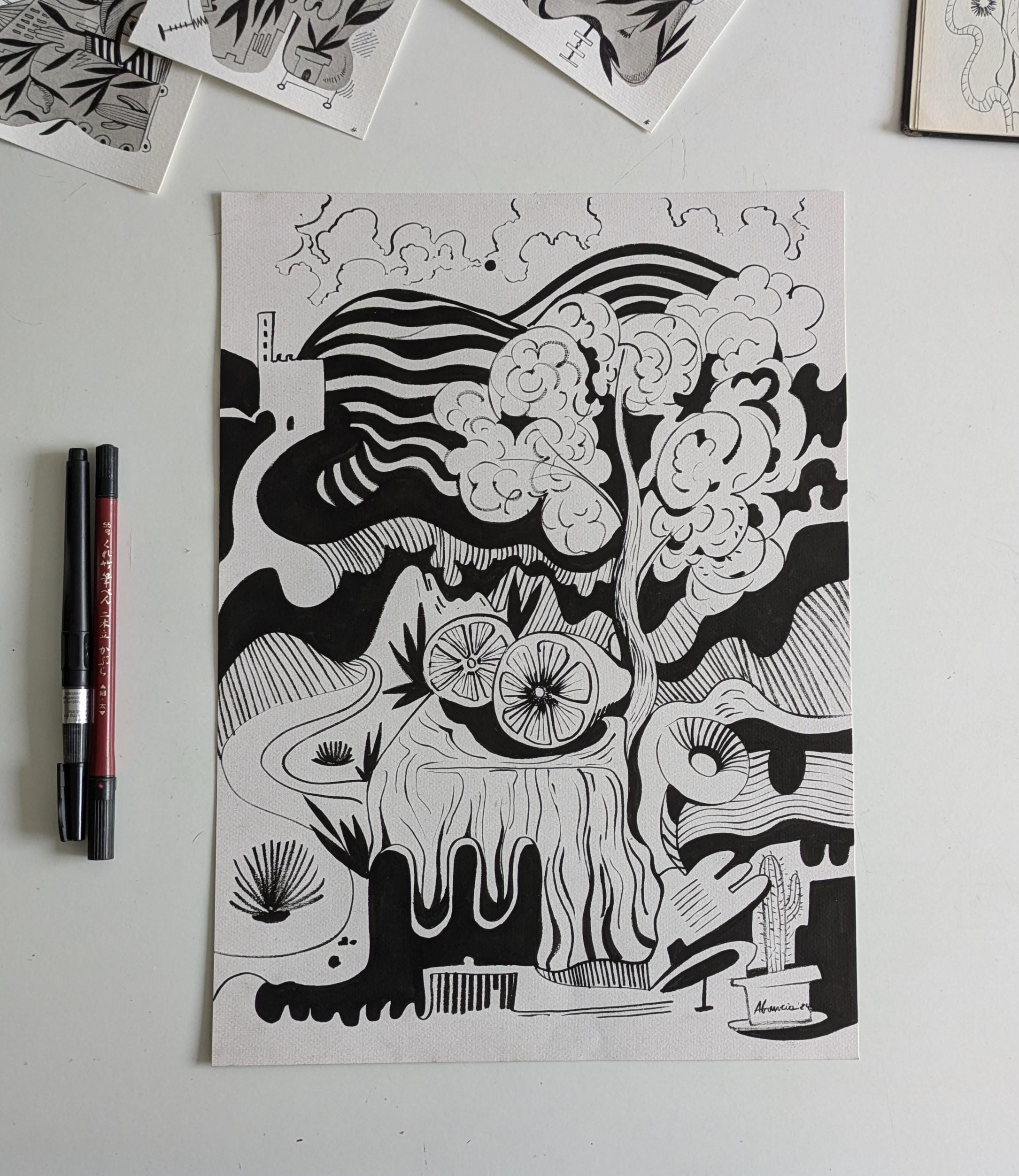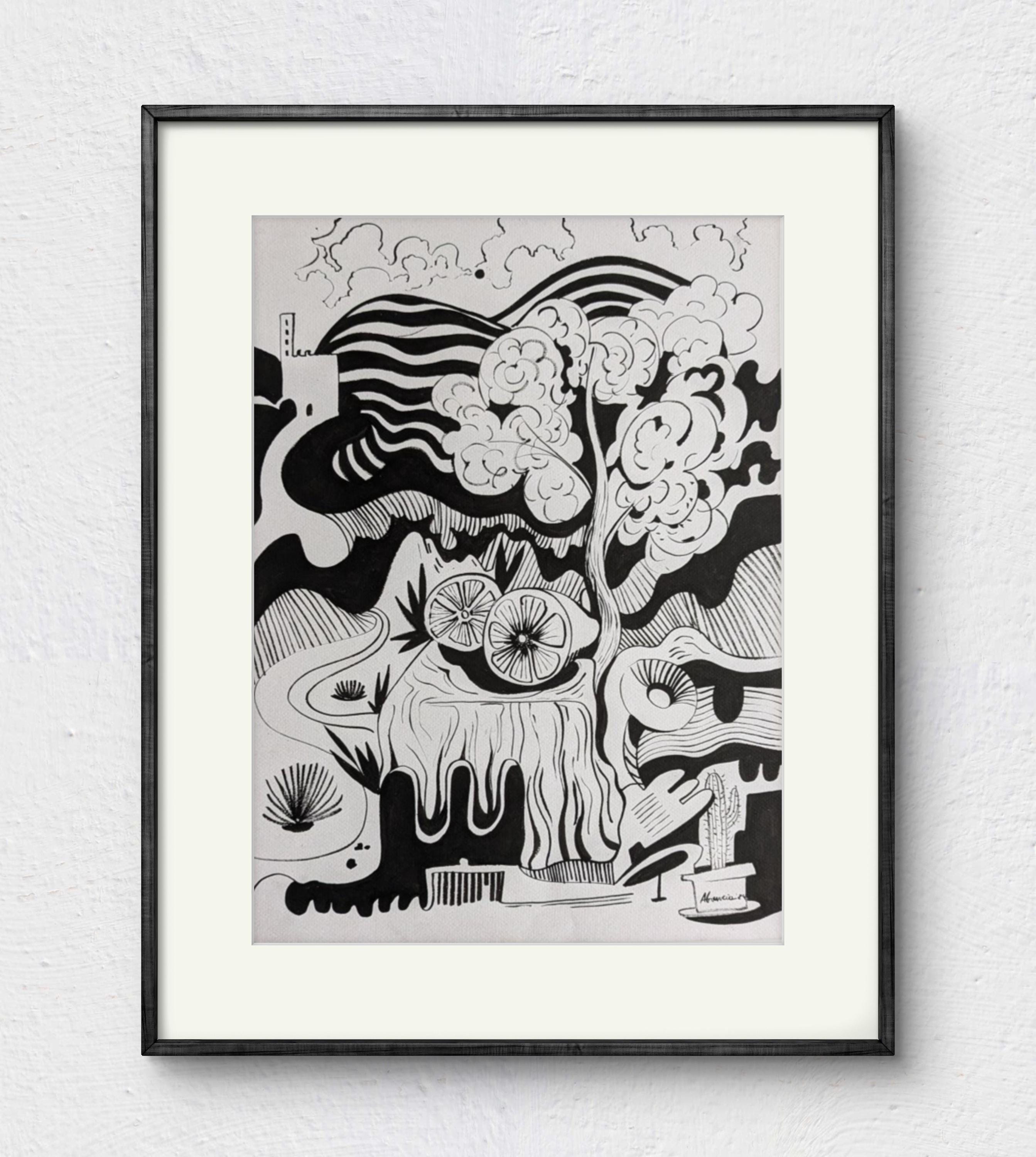 Lemons on the tableMedium: Indian Ink on paperDim.: 29.7 x 40,7cmIncludes certificate of authenticityDoes not include frame