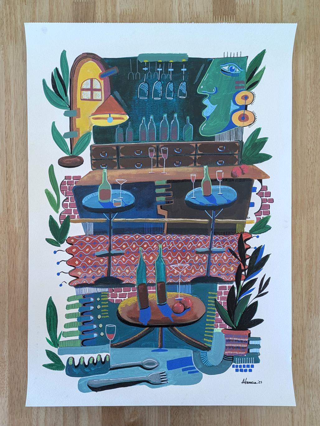 Title: Midnight at the BarTechnique: Mixed media on paperDimensions: 42 x 59,4 (A2)Notes: Includes certificate of authenticityFrame: Not included